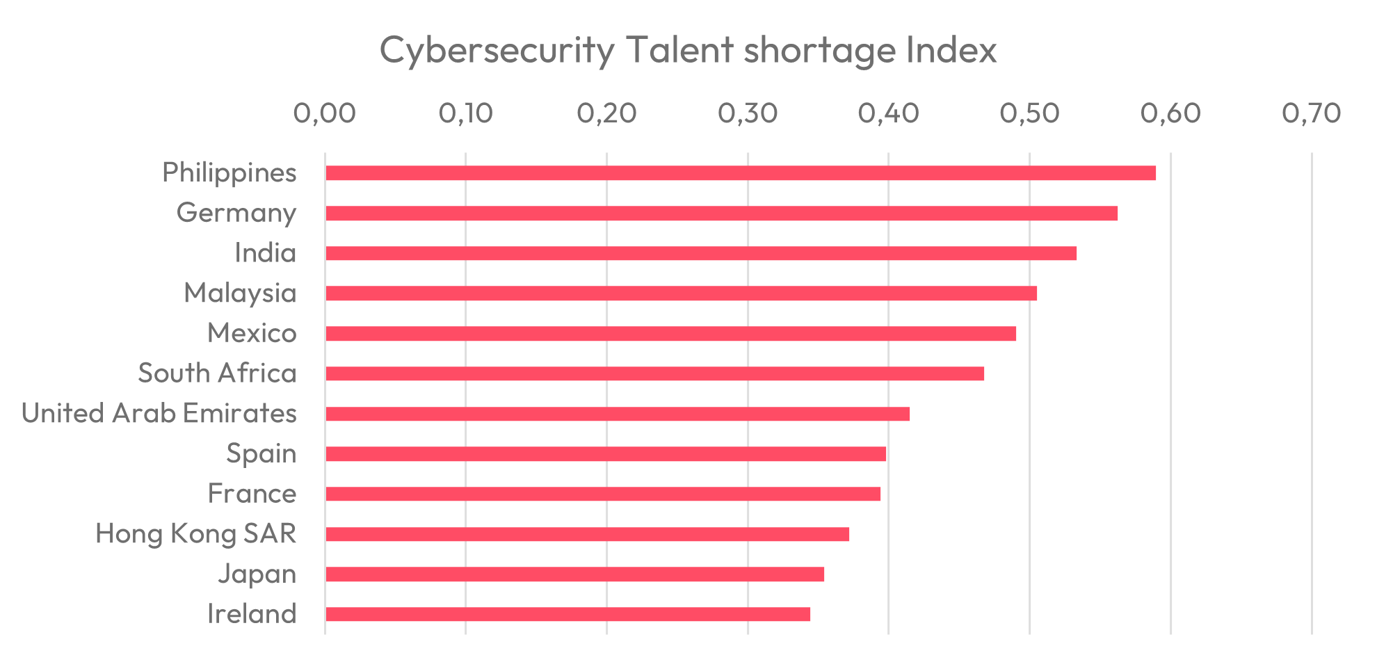 Cybersecurity is key to digital resilience, but the demand for cybersecurity experts is higher than the supply worldwide. The talent shortage index reveals that countries like the Philippines, Germany, India, and Indonesia are facing the steepest shortages. This shows a growing need, especially in fast-developing digital economies where cybersecurity is also developing.